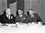 Baptist Convention. Left to right: Geo W. Truett, E. D. Head and Luther S. Scarborough. The trio of men are shown seated together at a dinner table with food set in front of them. Each of them are wearing dark, double-breasted suits and Scarborough is also wearing a pair of eyeglasses.