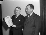 The Office of Price Administration (O. P. A.) is issuing the first award for voluntary service. Pictured left to right are Mark McGee and Bullock Hyder. Mr. McGee, the state director of the O. P. A., is issuing a certificate. He is wearing a three-piece suit. Mr. Hyder of Denton, Texas, is resigning from his post with O. P. A. He volunteered from January to October without collecting payment. He is resigning from the position to enter the Army. He is dressed in a pinstripe suit.