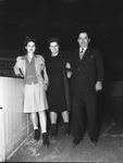 Mr. and Mrs. E. G. Crosier and daughter, Margie, at ice rink. The family of three are shown arm in arm as they skate near the fence of the rink. Each of them are smiling happily at the camera and appear in good spirits. Crosier is wearing a dark, double-breasted suit; Mrs. Crosier is wearing a dark dress with a coat and Margie is wearing a blouse, skirt and jacket.