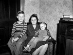 Mrs. E. R. Craig and sons, Albert Boyd and Billie Joe. Mrs. Craig is shown sitting in a textured armchair with her son, Billie Joe, sitting on her lap and her other son, Albert Boyd, sitting on the chair's armrest. Mrs. Craig is wearing a dark dress while her sons wear similar outfits. Albert is wearing a long-sleeve, striped shirt with suspenders on his trousers and his brother is wearing the same shirt with a pair of overalls. Published in The Fort Worth Star-Telegram Evening Edition November 25, 1942.