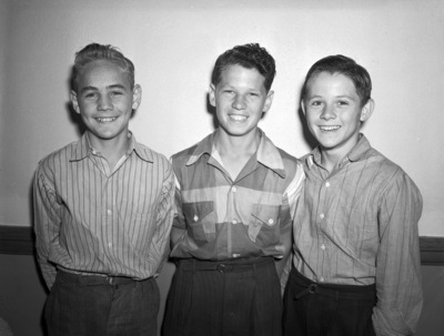 Newly elected officers of the high eighth grade of J. P. Elder Junior High School are, left to right, Billy Smith, vice president, Bob Menefee, president, and Buren Alexander, secretary. The three young boys are standing in front of a blank wall with their hands behind their backs. They are wearing trousers and striped shirts and they are smiling.