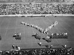 Football. Texas Christian University (T. C. U.)- Texas University. Shots of band maneuvers on field between halves. Barbara Bundock , at head of band.