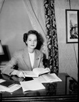 Miller, Sidney (Miss); Clothing & dress; Desks; Windows; Curtains; Lamps; Framed pictures