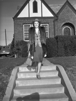 Mrs. Mason Mayne, of Lufkin, Texas, the former Miss Emilie Mae Bass, during her visit to her parents, Doctor and Mrs. E. W. Bass, of Fort Worth, Texas. She is walking down the steps outside of her parents' house. She is wearing a plaid blouse, a skirt, a fur coat and a hat. She is carrying a handbag.