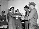 Tarrant County, Texas, Scrap metal drive. Left to right, Mrs. Harry N. Ward, Mrs. Ed Deupree, Truman Barton of the Quartermaster Depot, and Private First Class Roger Burns from Tarrant Field, Texas.