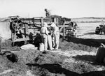 Hood County Home Demonstration Club. Women working with peanut threshing crews. Mrs. Walter Alexander (left) and Mrs. Vernon Musick hold a sack for Mrs. Julia Camp (center). At right, Mrs. Ella Gilliland is "cleaning up." The women are shown working outside in long pants and long-sleeve shirts with scarves covering their hair. In front of them is a large contraption where an unnamed man can be seen at the top scooping out the peanuts.