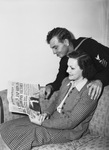 John James Moore, machinist's mate of the Navy Air Corps with his sister, Mrs. Guy Simons. Mrs. Simons is shown sitting on a couch looking on at a newspaper while her brother stands behind the couch and points at the headline on the newspaper. He is dressed in a naval uniform while his sister is wearing a gingham printed jacket and skirt with a blouse underneath. Moore returns home after U.S. victory against Japan.