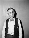 H. C. Kay is part of the "A-to-K" group that will register for mileage rationing books on November 17, 1942. Mr. Kay is a local druggist. He is shown standing against a wall, wearing a button-up shirt, bow tie, vest, and trousers.