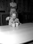 Shown is 2 years old child Gail Mooneyham at the Castleberry Nursery. This girl is sitting at a table and eating her breakfast from a small bowl. Breakfast bowl and mug are on the table and she is holding a spoon up to her mouth. Gail is wearing a patterned dress with two small pockets on the front. Behind her, an unidentified woman is standing. Published in The Fort Worth Star-Telegram evening edition, November 16, 1942.