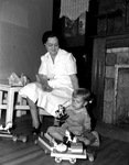 Shown are Mrs. Audie Hall, attendant at the Girls' Club nursery, and three-year old boy Jimmy Murray. Mrs. Hall sits in a small wooden chair besides Jimmy who is sitting on the floor with a pile of toy cars and horses surrounding him. Jimmy is wearing a small jumpsuit and a shirt with a wide collar underneath. Mrs. Hall is wearing a short-sleeve, long dress and has her hand on Jimmy's back. Mrs. Hall helps Jimmy get started on his first day away from home. Published in The Fort Worth Star-Telegram evening edition, November 16, 1942.