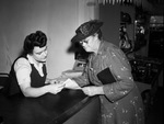 Gasoline rationing registration. Mrs. C. V. Wheeler, obtaining a basic "A" application form from Mrs. June Watkins, clerk.