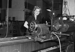 Mary Alice Sharp is working at a machine in a factory. She is wearing a dark colored apron. There is various machinery in the background.