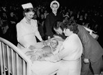 Infantile paralysis (polio). Sister Kenny treatments. Jerry Shrader, 2, the patient; around him are Miss Irmadine Allen, supervisor at Harris Memorial Methodist Hospital; Mrs. A. J. Shrader of Fort Stockton; Doctor Charles F. Clayton, and his assistant, Miss Irene Lang. Jerry is laying in a hospital bed while the doctor and the nurses crowd around him. Jerry is laying shirtless as Doctor Clayton inspects him and Miss Lang presses a bandage on Jerry's leg. The other two women stand at the opposite side of the bed and look on. Behind the demonstration is a crowd of seated people also looking on.