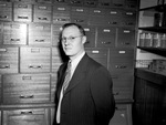 W. C. Bigby, president of Texas Seedmen's Association. Bigby is shown standing in front of a wall of file cabinets. He is wearing a striped suit with a patterned tie and a pair of eyeglasses. He has his arms behind his back and appears to be looking on at the camera.