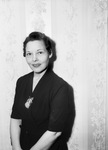 Miss Martha Justice. Miss Justice is shown standing in front of an empty wall wearing a half-sleeve, dark dress with a large brooch at the center of her neckline. She is looking on at the camera and smiling. She is in the "head man" of the Panther Boys Club after working with them for 16 years.