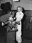 Mrs. Marie Prestridge, operating machine at Fort Worth War Industries; Training School. Mrs. Prestridge is shown wearing a pair of coveralls as she operates the milling machine. Mrs. Prestridge was a former beauty shop operator. Behind her is a wall with planks of wood laying up against it. Mrs. Prestridge appears focused.