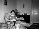 Mrs. Roy F. Crabtree. Mrs. Crabtree is shown wearing a gingham-printed dress and sitting in a floral-patterned armchair with her legs resting on a small stool. To the right side of the chair is a small ottoman with a stack of newspapers laying on it and to the left of it is a desk with a lamp and framed pictures of her son, Corporal Roy N. Crabtree, on it. Published in The Fort Worth Star-Telegram Evening Edition November 19, 1942.