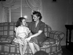 Mrs. E. J. Bridges and daughter, Barbara. The mother-daughter duo is shown sitting on a checkered couch, smiling at each other. Mrs. Bridges has her hand behind her daughter's back and her other hand resting near her knee. Mrs. Bridges is wearing a short-sleeve, dotted dress and her daughter is wearing a lighter colored dress with puffed sleeves. Mrs. Bridges has a husband, who works as a resident inspector at Texsteel Company, and Adrienne, her 10-year old daughter. Published in The Fort Worth Star-Telegram Evening Edition November 19, 1942.