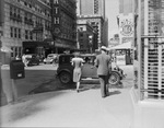 Shot of West Seventh Street, looking East, in Fort Worth, Texas. A man and woman are walking on the sidewalk, towards a car on the street. Around them are various buildings and shops, including the Worth Hotel and Sinclair Gasoline. The man is wearing a suit and hat and the woman is wearing a dress.