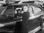 Gasoline Rationing registration. Mrs. L. M. Curry pasting "A" sticker to her wind-shield.