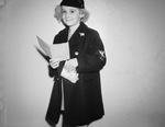 One of the youngest participants in Women at War Week will be Mary Joan Hughes, daughter of Mr. and Mrs. Olin E. Hughes, 1607 Boulevard. She opened her penny bank and bought a war bond in observance of her seventh birthday next Wednesday. She is seen holding war bonds and a handkerchief, wearing a a military coat and hat.