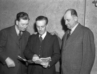 A. F. Baldus, of Fort Worth, Texas, (center) points out the route of Southwestern Greyhound Lines, Incorporated, on a bus pamphlet during the annual traffic meeting of the company in Fort Worth, Texas. Charles Brown, of Joplin, Missouri, president of the Crown Coach Company (left), and G. P. Schmal, of Fort Worth, Texas, vice president of Southwestern Greyhound, look on. Baldus is traffic manager of the lines. The three men are standing in front of a blank wall, wearing suits and ties. Brown and Schmal each have a hand on Baldus' shoulders.