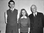 Officers of Paschal Ex-Student Association. Left to right: Edwin Carruth, Brooxie Nell Roberson and Roscoe C. Smith. The three are shown standing in front of an empty wall and smiling as they look on at the camera. Carruth is wearing a sweater vest with a long-sleeve shirt underneath and a pair of striped trousers; Miss Roberson is wearing a long-sleeve sweater with a collar; and Smith is wearing a dark, double-breasted suit with a pair of eyeglasses.