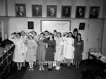 "Women at War Week" Left to right, front row: Mrs. Gordon Wiley, Mrs. H. B. Fuqua, Mrs. Dave Miller, Miss Helen Snyder, Mrs. Tom Payne, Mrs. W. H. Brown, Mrs. D. C. Proctor; back, Mrs. Paul Leeper, Mrs. Ed P. Byars, Mrs. Harry Anderson, Mrs. Sidney Price, Mrs. Garry Gateley Junior, Mrs. J. H. Thomas. The group of women are shown standing in a room, each of them saluting and wearing a different uniform. Some women have uniforms for the Red Cross while others wear nurse uniforms and uniforms from other organizations.