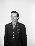 Lieutenant William M. Rowe is a 24-year-old pilot in the Army Air Forces. He spent 18 months overseas in the Pacific Theater. He was stationed in Bataan, Philippines, up until the last few days of the battle. Lieutenant Rowe and several other pilots escaped the ordeal and flew to Australia. Lieutenant Rowe is back in the States to train other fighters. He is standing against a wall, dressed in his military uniform.