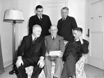 Texas State Manufacturers Association. Seated, left to right: Porter A. Whaley of San Antonio, Texas; W. C. Trout of Lufkin, Texas; and A. J. Branscom of Houston, Texas. Standing, left to right: Walter W. Trout of Lufkin, Texas and Arthur H. Stenzel, Houston, Texas. The men are dressed in dark, double-breasted suits with W. C. Trout wearing glasses. W. C. Trout is reading from a piece of paper as the other men look on. To the side of them is a standing lamp.