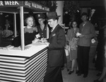 "Women at War Week." Bond sales. Mrs. Malvern Marks selling a bond to her husband as Lieutenant Herbert G. Mead of Camp Lee, Virginia, looks on. Mrs. Marks stands at a war bonds booth while Mr. Marks stands on the other side of the booth and signs off on a bond. Mr. Marks is wearing a dark, striped suit with a pair of eyeglasses and a brimmed hat while Mrs. Marks is wearing a long-sleeve dress. Lieutenant Mead stands at the side of Mrs. Marks, outside the booth, and looks on approvingly at the sale. To the side of the booth, other unnamed people look on.