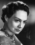 Copy of photo of Ida Belle Hicks. Ms. Hicks appears in the center of the photograph. Only her head, neck and shoulders are visible and they take up most of the photograph. She is staring towards the bottom right of the photograph and is smiling slightly. She appears to be wearing a sweater and a necklace that consists of circles that are connected and follow a large, small, small pattern. Her hair is dark and short. On his shoulders and face appears to be a reflection of light.