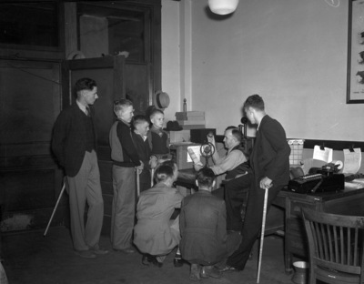 Boys from Hockley County, Texas, who visited the Livestock Exchange Building in Fort Worth, Texas, shown watching F. R. Sawyer, assistant livestock marketing specialist, as he broadcast market reports over station KGKO. The boys are, left to right, Ralph Harbin, Ralph Gerik, Leland Gwin, John Silhan, Gorman Walden, Bennie Silhan, James Stroope and Howard Wood. This group placed first in the third annual junior livestock show held at Levelland, Texas. They are crowded around Mr. Sawyer, who is sitting at a desk with a radio microphone in front of him.