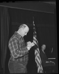 One hundred ten newsboys gather at the Elks Club enjoying their annual Thanksgiving dinner. At the dinner, Monroe Odom, West Seventh streets news vendor, reading cablegram from Amon G. Carter, publisher of the Fort Worth Star-Telegram, who is in London. Odom is standing next to a United States Flag on a pole. Odom is wearing a plaid jacket and dark corduroy pants. An unidentified man, wearing a suit, is in the background sitting next to a piano. published in the Fort Worth Star-Telegram morning edition, November 27, 1942.