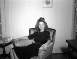 Mrs. George H. Ropp. Mrs. Ropp is shown sitting in an armchair, smiling at the camera with her hands holding onto the sides of the chair. Mrs. Ropp is wearing a dark, short-sleeve dress with small beaded detailing around her collar, dress sleeves and waist. To one side of the chair is a small table with a doily and a book resting on it. Behind her is a wall with a framed picture.