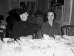 "Women at War Week". Representing the Fort Worth Quartermaster Depot at the "Women At War Week" bond selling luncheon in Hotel Texas were, left to right, Mrs. Dorothy E. Tyrrell, inventory supervisor of all depot property, and Mrs. Della S. Newell, who checks outgoing shipments of clothing to posts and camps. Mrs. Tyrrell and Mrs. Newell are both sitting at a dinner table with Mrs. Tyrrell smiling and looking to her left and Mrs. Newell looking on at the camera. Mrs. Tyrrell is wearing a dark, long-sleeve dress, a cross necklace, and a hat. Mrs. Newell is wearing a simple, short-sleeve dress. On the table in front of them, there is a variety of plates with different foods, along with glasses of water. Behind them is another table of people conversing.