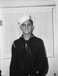 Harold Burton is a sailor in the United States Navy. He is one of the survivors of the Navy Destroyer Blue, that was sunk in the Solomon's shortly before Labor Day. A Japanese torpedo struck the ship. At the time of the explosion, Burton was in gun turret three. He was unconscious for 12 hours before joining other crew members on deck of a rescue vessel. Burton is a native of Fresno, California. He is spending his furlough in Fort Worth, Texas, with one of his Navy pals. He is shown standing in front of a door, dressed in his military uniform.
