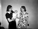 Mrs. K. C. Bowman holds her two month old son, Kirby Pease, while her sister, Mrs. George Stain of Odessa, Texas, looks on admiringly. Mrs. Bowman is wearing a dark, short-sleeve dress while her sister is wearing a short-sleeve, leaf-patterned dress. Mrs. Bowman cradles her baby with both hands as Mrs. Stain holds the back of the baby. Published in The Fort Worth Star-Telegram Evening Edition November 26, 1942.