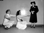 Paschal Homecoming: Mrs. Spencer Smith, right, watching a yell leading demonstration given by Flake Tompkins and Joanne Olmsted. Miss Olmsted and Mr. Tompkins are shown in a squatting position with their arms extended. Mrs. Smith looks on at them are they continue their demonstration. She is wearing a long, dark coat-dress with a pair of gloves in her hands and a hat. Mr. Smith is wearing a long-sleeve sweater and a pair of trousers and Mrs. Tompkins is wearing a long-sleeved, belted dress. Published in The Fort Worth Star-Telegram Morning Edition November 26, 1942.