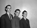 "Three of the De Molay members who will be sworn in Friday morning as city officials for a day, are left to right, Sam Paschal Junior, 3241 Hanger, city manager; Wayne Hagood, 906 East Richmond, judge of Corporation Court; and Jack Edwards, 1300 East Myrtle, city engineer. De Molays will man all city posts in observance of Citizenship Day." The trio is lined up against a wall, from tallest to shortest, back to chest.