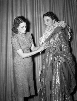 Junior League members will present the children's play "The Magic Well," in public schools. Mrs. Charles Scaling, left, is shown giving Miss Jo Marie Bevan, one of the cast, a fitting for her costume. They are standing in front of theater curtains. Mrs. Scaling is wearing a dress. Miss Bevan's costume consists of a dress and a long robe.