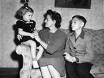 Mrs. Jeff S. Henderson and her daughter, Sandra, and son, Jeff II. Mrs. Henderson and Jeff II are shown sitting on the couch together. Sandra is being held by her mother as she sits on the arm of the couch. Sandra is wearing a dark, small dress, Jeff II is wearing a suit and Mrs. Henderson is wearing a long-sleeve dress as well. The couch is patterned with flowers and on the wall behind them hangs a framed picture. Captain Henderson, the father, is a personnel officer at the Quartermaster Depot.