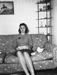 Mrs. Travis E. Wade. Mrs. Wade is shown sitting on a floral patterned couch with a small pile of postcards on her lap and set next to her. She is wearing a dark skirt and a long-sleeve blouse with a small tie near her collar. She is also smiling at the camera. Behind her is a wall with a framed picture of a man on a horse hanging up. There is also a tall display shelf with a few vases set on it.