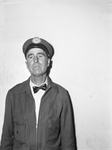 R. L. Adkinson, former city postman, to join Navy's Seabees. Adkinson is shown standing in front of an empty wall wearing a small coat, a postman's hat and a bow tie. Adkison, postman for 15 years, signs up for the Navy's Seabees seeking to avenge his son, R. L. Junior, who was killed in the Solomons.