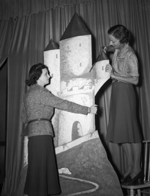 Junior League; Stage props; Backdrops; Coats; Theater curtains; The Magic Well; Fitzpatrick, J. E. (Mrs.); Hume, John (Mrs.); Theatrical productions; Saws; Sets (Architectural Elements); Castles & palaces