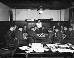Gas Rationing Helpers. Marines from Marine Corps Air Station. Left to right, backs to camera, Private First Class G. A. Lewis, Private First Class T. F. Ryan, Private First Class J. W. Rybos and Private D. W. Smith. Others, seated, left to right, Private First Class H. T. Brosch, Corporal V. A. Rosciglione, Corporal Leo Easel, Corporal J. L. McGahanm Private First Class B. E. Brock, Private First Class J. F. Olita, Corporal R. E. Hennessey. Standing are Miss Ethel Martin and Sergeant Charles H. Micha.