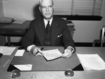 Office of Price Administration heads. Wendell W. Wood. Wood is shown sitting at a desk in an office. He is wearing a striped suit and a pair of eyeglasses. On his desk are a few documents and smaller sheets of paper. He also appears to be signing one form in particular. Behind him is another desk and a window.