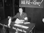 "Women at War Week." Mrs. John B. Collier Jr., top bond saleswoman for the "Women at War Week." Mrs. Collier sold $13,450 in war bonds in 50 minutes at Washer Brothers. Mrs. Collier is shown seated at a desk with a stack of war bonds and a receipt machine. She is wearing a buttoned up jacket with two pins on her jacket's lapel. On the front of the desk are posters that surround it depicting a woman walking with the words, "She's Ready, Too". Mrs. Collier is smiling at the camera.