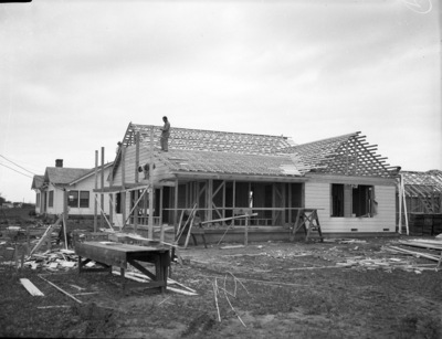 Exterior view of the residence of Mr. and Mrs. J. M. Goodwin under construction, in Arlington, Texas. Two construction workers are standing on the partially built roof of the house. This is one of the many new homes built or under construction since the first of the year 1940. It is located about half a mile east of North Texas Agriculture College in a new residential section sponsored by teachers in that institution. Mr. Goodwin is in the engineering department of the college.