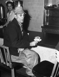 Coffee Rationing. H. C. Nelson, drinking coffee. Nelson is shown sitting at a bar with a small cup of coffee to his side. He is wearing a brimmed hat and a pair of eyeglasses. He is also wearing a jacket with a pair of trousers. Behind him is an unnamed waitress.